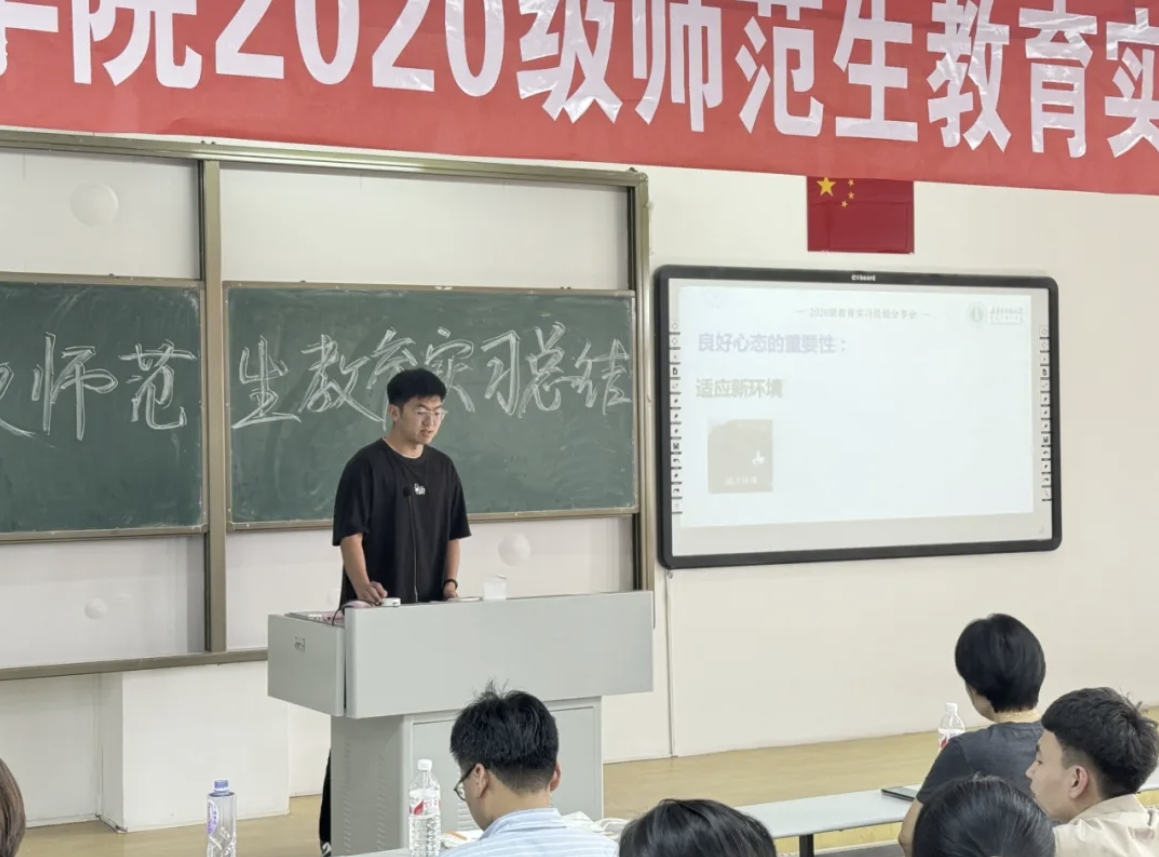 王奕博同学主要分享了身为教师的责任,应对压力的方法。特别讲到在教育实习中要坚持不懈,持之以恒。分享了克服困难和挫折的经历,提醒我们要保持初心,不断追求进步,坚持对教育事业的热爱和信念。