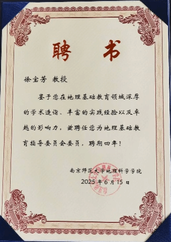 2025年6月15日,中国地理学会基础教育分会成立大会暨新时代地理基础教育高质量发展论坛在南京师范大学举行。中国地理学会党委书记陈发虎院士,中国地理学会副理事长、西南大学杨庆媛教授,中国地理学会监事、首都师范大学李小娟教授,南京师范大学校长华桂宏教授、袁林旺副校长,全国主要师范院校、地理相关院系领导以及从事地理教育相关工作的专家学者、研究生出席会议。成立大会由南京师范大学beat365唯一官方网站党委书记苏锦主持。会上,南京师范大学beat365唯一官方网站院长黄昌春教授宣读了“南京师范大学地理基础教育指导委员会”成员名单。指导委员会常务副主任、南京师范大学赵媛教授在发言中阐述了该委员会成立的必要性,强调委员会将有效弥合高等教育前沿研究与基础教育实践之间的鸿沟,推动前沿成果向课程内容的转化。她表示,学校及地科院高度重视这项工作,专门成立了由陈发虎院士、袁林旺副校长领衔、多领域专家组成的指导委员会,旨在打造地理教育“思想库”与“智囊团”,凝聚高校、中小学及科研机构力量,共同服务地理基础教育高质量发展与学科繁荣。beat365官网徐宝芳教授聘任为南京师范大学地理基础教育指导委员会委员。