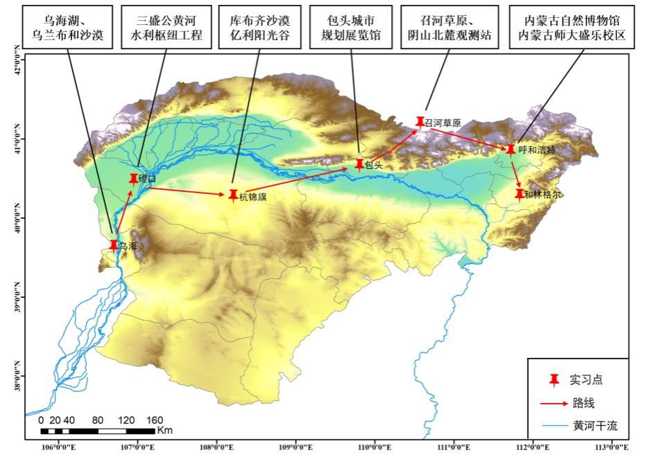 本次联合实习主题为:黄土黄沙黄河行,绿水青山中国梦。聚焦国家“黄河流域生态保护和高质量发展”战略, 以黄河“几字弯”典型区域为核心实习区,跨越陕西、宁夏、内蒙古、山西四省,培养地理学子从“要素认知”到“系统治理”的进阶思维,为筑牢北方生态安全屏障提供科学认知与人才支撑。