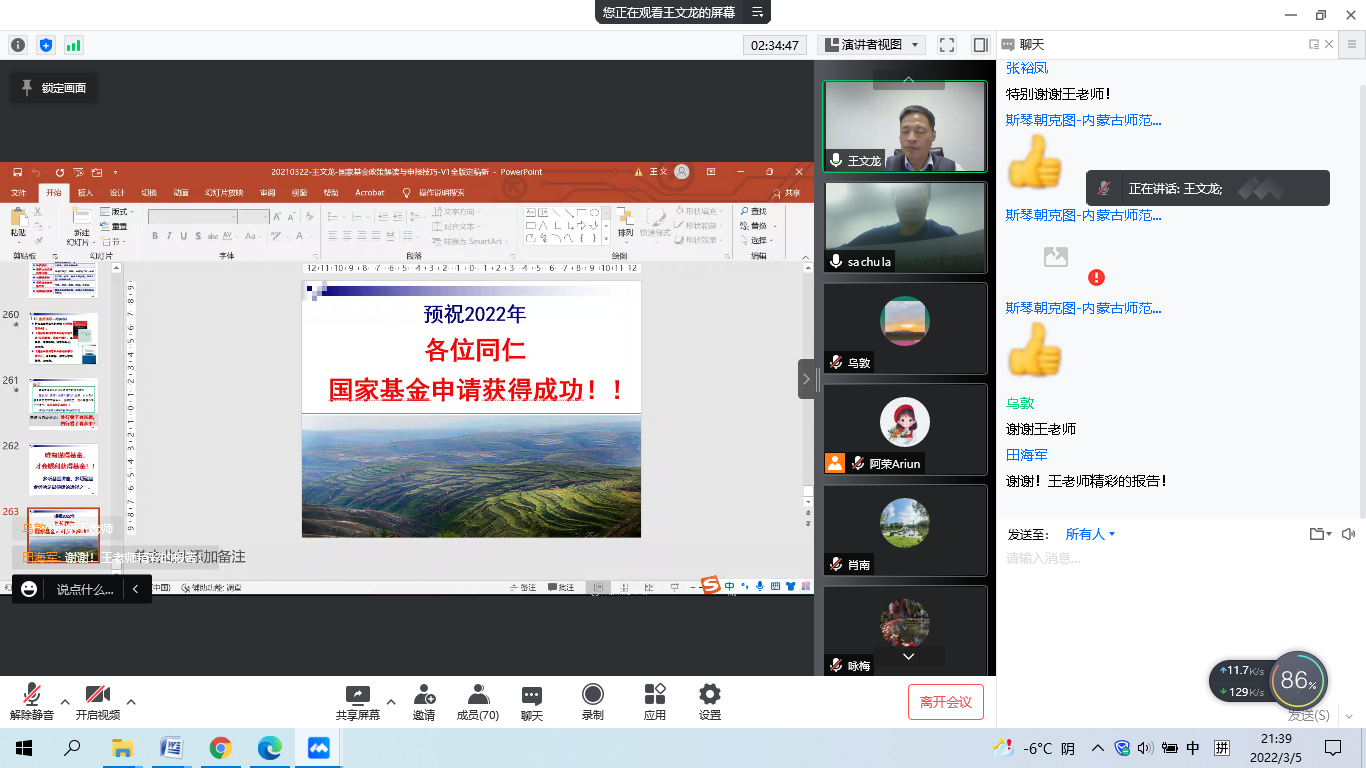 2022年3月5日,beat365唯一官方网站邀请了中国科学院水利部水土保持研究所王文龙研究员,为beat365官网教师分享国家自然科学基金政策的新变化以及申请书的撰写技巧。讲座采用腾讯会议方式进行,由副院长萨楚拉老师主持,书记张裕凤、院长包玉海及近70名老师和博士研究生听取了报告。