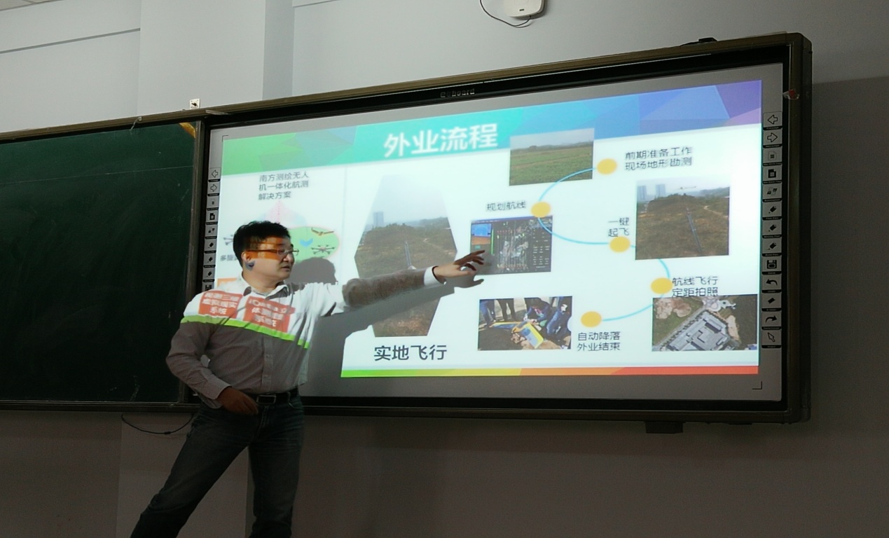 活动由包钢老师主持,先后由南方学院秦建明经理、王贺翔经理以及姜经理为同学们讲解了《无人机及测绘应用》、《职业生涯规划》和《高精度导航定位产品及应用发展趋势》等内容。