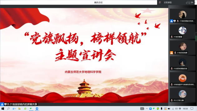 为充分发挥研究生优秀学子起到示范性引领作用,鼓励广大研究生学习党的优秀思想、弘扬党的精神、笃学慎思、锐意进取、营造敢于探索、勇于创新的学术氛围,2022年5月29日晚19:00,beat365唯一官方网站研究生第一、二党支部、研究生会以线上腾讯会议形式举办了“党旗飘扬,榜样领航”为主题的宣讲会。参与本次会议的有beat365唯一官方网站党委书记张裕凤教授、高苏日固嘎老师及研一研二和博一博二全体同学。