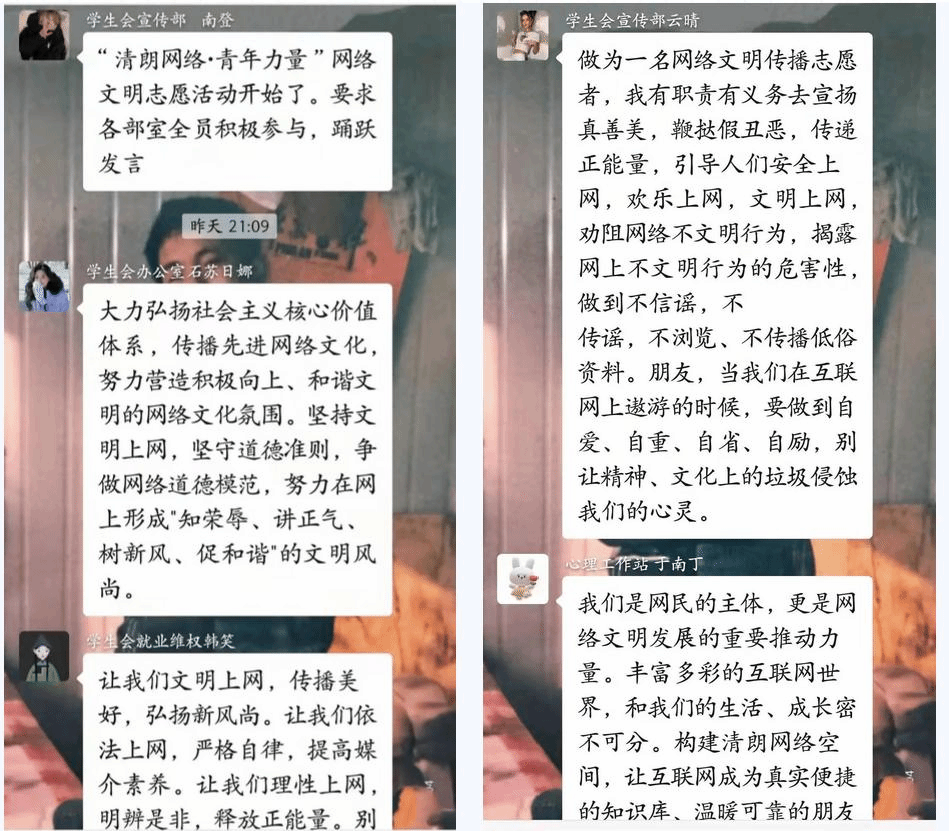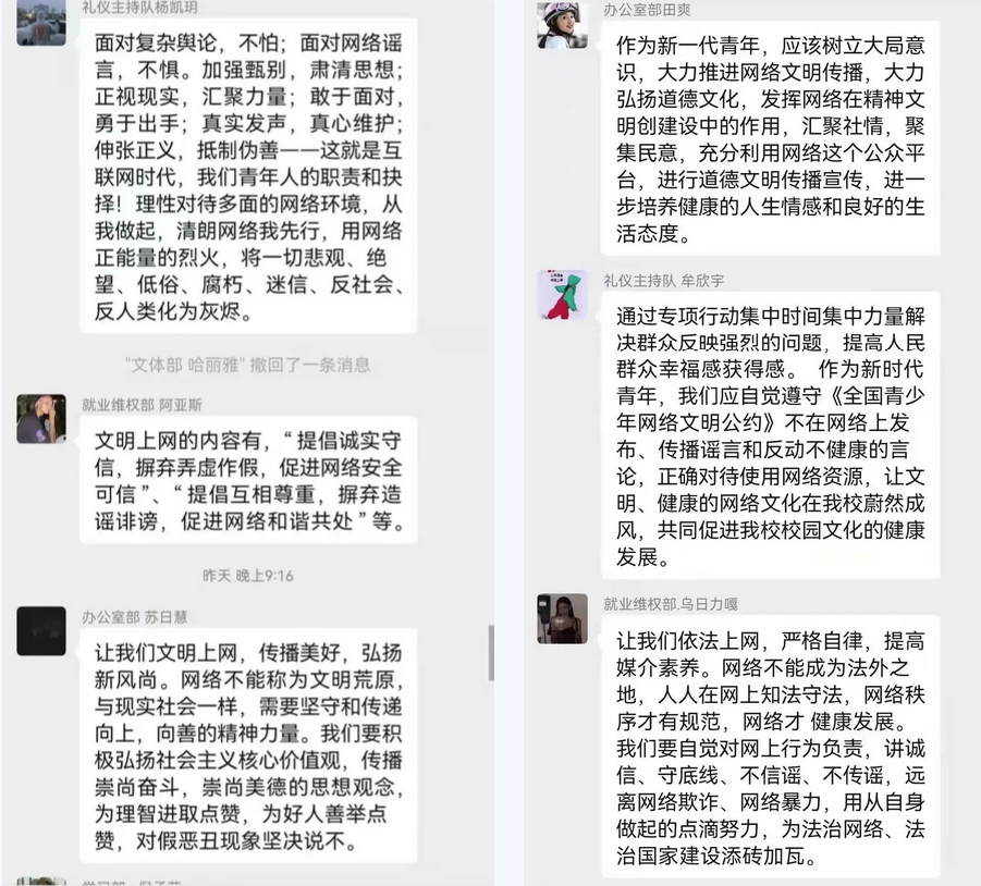 为进一步培育和践行社会主义核心价值观,切实维护国家意识形态安全,动员广大青年积极参与构建网络安全空间,2022年3月4日21:00beat365官网志愿者服务总组织队各部室成员开展“清朗网络,青年力量”活动。通过微信参与有关网络文明话题讨论,引导同学们规范网络语言、举报不良信息、抵制网络谣言,帮助学生树立正确的网络观念,文明上网。